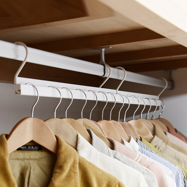 | 場所をとるお手持ちのハンガーラックやクローゼットのハンガーバーにセット(掛けるだけ)するだけで洋服をナナメに設置可能、特許権申請中,意匠権登録商品、 |
