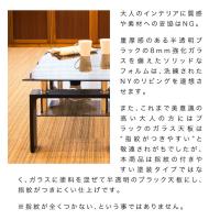 | 人気のガラステーブルに新色クリアブラックを追加しました。 ガラス天板は半透明のブラック色。美しく高級感があり、リビングや応接空間の雰囲気を高めます。 もちろんガラス天板は8mmを採用。 5mm,6mm商品と違って面取り加工と強度が違います。 他社品にある黒塗り塗装と違い、ガラスそのものに色を加えていますので色剥げなどの心配はありません。 脚部分は傷に強いオーク木目柄の強化シート張りです。 塗装ではありませんのでこちらも色剥げの心配がありません。 塗装で色付けした商品や、塗装の脚は「汚れが目立つ」「使っていたら色が取れてきた」などのお声を形にしました。 しかも当社品は高さの微調整が可能なアジャスター脚です。 フローリングやカーペットの小さな段差は問題ありません。 同シリーズのクリアガラステーブルの実績は、ガラス部の不良率は現在のところ0.1%以下です。 ガラスは怖い・危ない、部屋に高級感が欲しい、程よい価格で手に入れたいとお考えのお客様にピッタリです。 通常のクリアガラステーブルよりもさらに高級感や美しさをグレードアップしたクリアブラックです。 通常6mmのところ、8mm天板の採用。 8mmだからできる強度と美しいカッティングが魅力です。 一般的なフロストガラスの5倍近い強度を持ち、万が一割れても破片が飛び散らない、強化ガラスを使用。 安全性にも優れております。 中棚は6mm厚のミストガラスを採用。 お気に入りの雑誌や雑貨をディスプレイ収納できます。 普段からよく使うリモコンやティッシュの置き場所としても便利です。 脚部にも上質感のある美しい仕上げを採用しました。 耐荷重は天板が30kg、中棚が10kgのしっかり設計。 厚みのある強化ガラスと脚部により、一般的な木テーブルと同じくらいの高い強度を実現しました。 大きすぎない96cm×50cmサイズ。 よくワイドが幅110cmや120cmのリビングテーブルを目にしますが、平均的な2人掛けソファにはこちらのサイズ感の方が邪魔にならず、快適にお使い頂けます。 また、幅だけでなく高さもとても大切。 ソファーテーブルとして使用する場合には、こちらのような少し高めのセンターテーブルがお勧めです。 通常ガラステーブルよりも丈夫で安心なので応接、施設、ロビー、喫茶店、カフェ等での使用もお勧めです。 ガラスリビングテーブル ローテーブル 応接セット 施設ロビー カフェテーブル ソファテーブル 見栄え 透明感 来客 収納テーブル 清潔感 大人のリビング マンション 打ち合わせ 飲食 デザイン性 きれい 涼しい ワイド1000 ちょうどいい ゴージャス 食事 ラウンジ モダン コーヒーテーブル コンテンポラリー デザイナーズ 北欧 応接室 待合室 塩系 飛散防止ガラス 幅100cm |