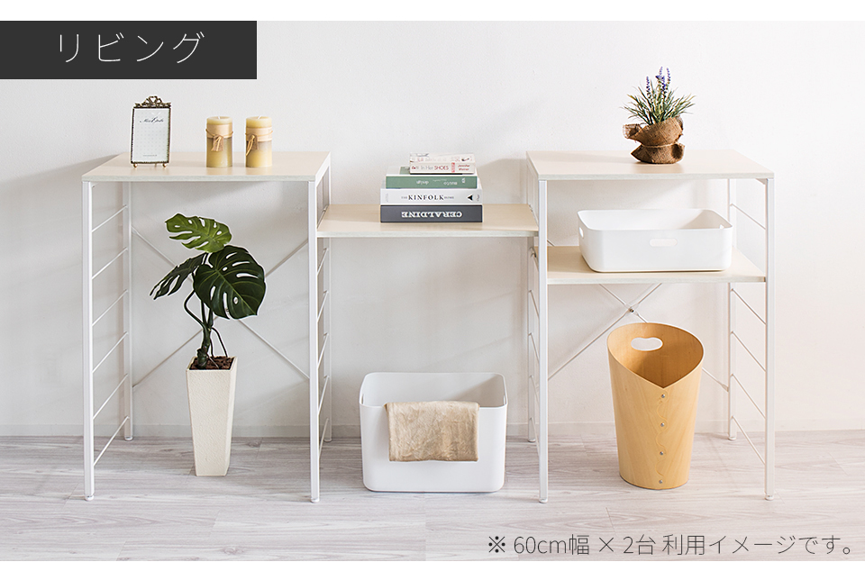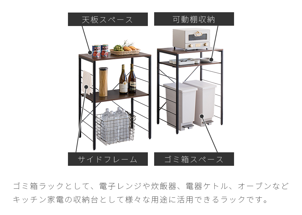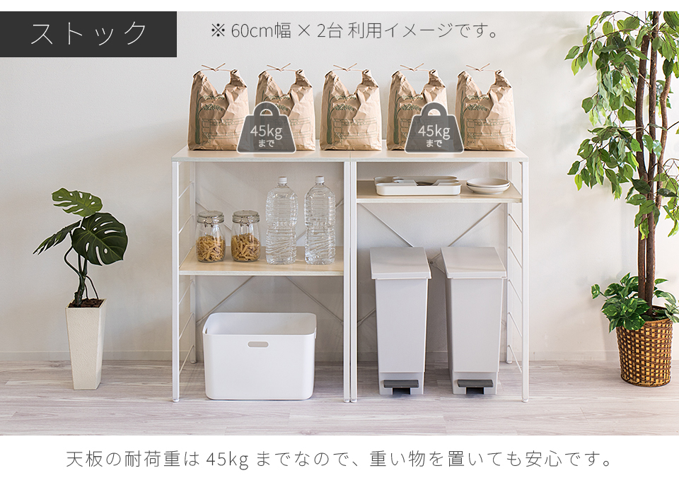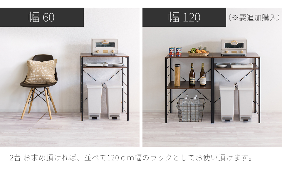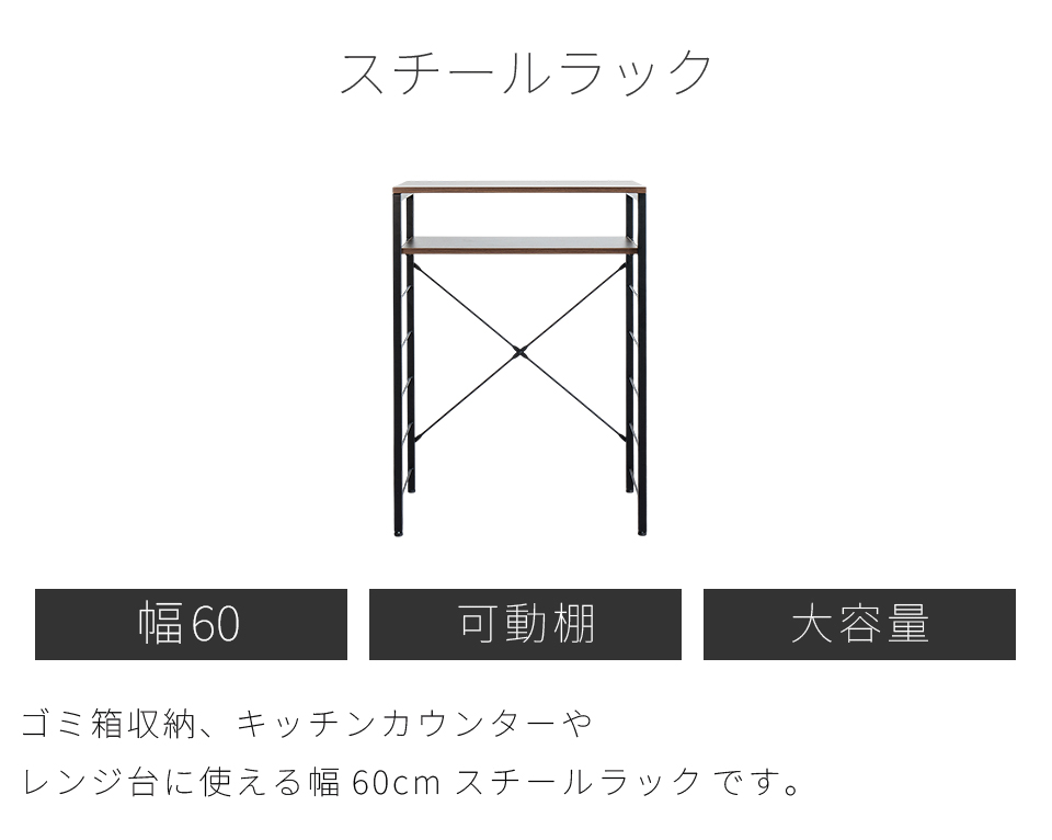 | スチールラック 幅60 ゴミ箱収納キッチンカウンター やレンジ台に使える W60のスチールラックです。 シンプルなごみ箱上ラックや、電子レンジや炊飯器、電気ケトル、オーブンなどキッチン家電の収納台にも使える、設置の自由度が高い収納ラックです。 幅60cmは、同シリーズ商品の追加購入で「個別」「並列」「連結」の3パターンの使い方が出来ます。 棚板は可動棚を採用。食器・調理器具・キッチン家電・食品ストックなど幅広い収納物に柔軟に対応いたします。豊富な収納力としっかりとした耐荷重で、キッチン家電のまとめ置きも可能です。 樹脂製アジャスターを装備し、床へのキズ防止と、高さ調節やガタツキを抑えます。 天板はキズや水濡れに強いメラミンシートを採用しており、キッチンなどの水周りや作業台(ワークスペース)としての利用にも最適です。 クローゼットやウォークインクローク内のラックとしても大変便利です。 扇風機や加湿機などの季節家電、衣替えの布団、スーツケースなど足元で邪魔になる品々が棚に収まり効率よく整理収納出来ます。 | |||
