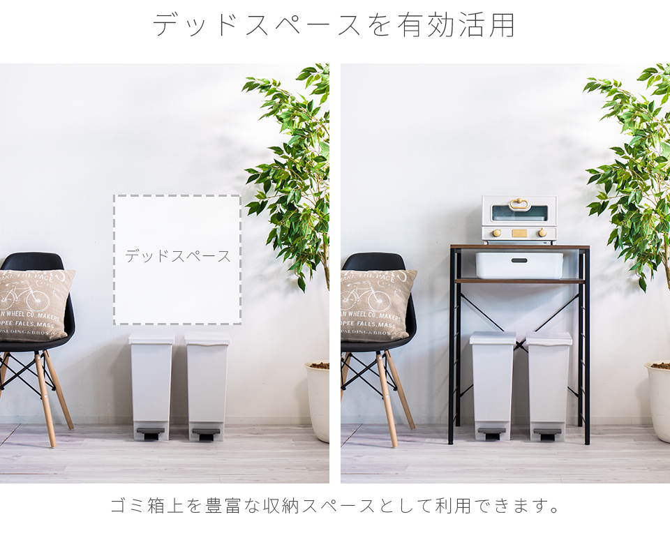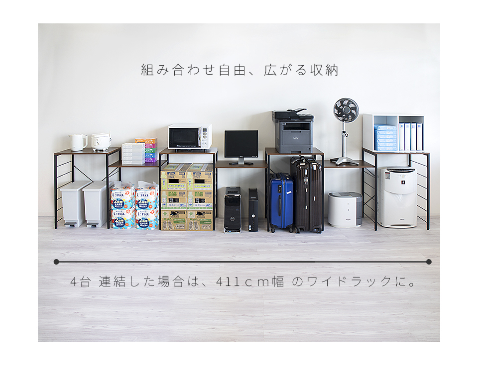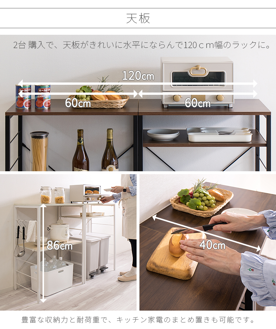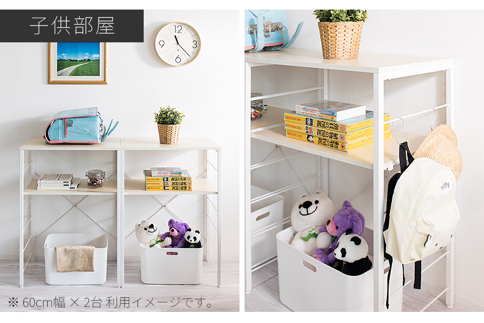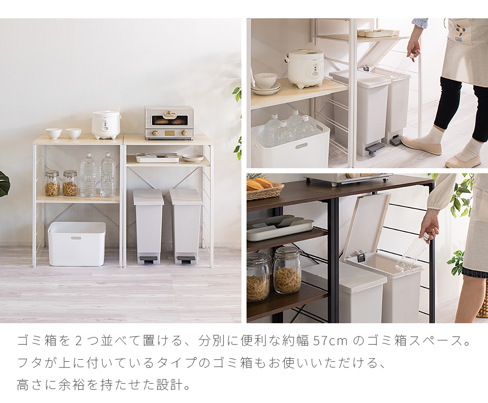 | スチールラック 幅60 ゴミ箱収納キッチンカウンター やレンジ台に使える W60のスチールラックです。 シンプルなごみ箱上ラックや、電子レンジや炊飯器、電気ケトル、オーブンなどキッチン家電の収納台にも使える、設置の自由度が高い収納ラックです。 幅60cmは、同シリーズ商品の追加購入で「個別」「並列」「連結」の3パターンの使い方が出来ます。 棚板は可動棚を採用。食器・調理器具・キッチン家電・食品ストックなど幅広い収納物に柔軟に対応いたします。豊富な収納力としっかりとした耐荷重で、キッチン家電のまとめ置きも可能です。 樹脂製アジャスターを装備し、床へのキズ防止と、高さ調節やガタツキを抑えます。 天板はキズや水濡れに強いメラミンシートを採用しており、キッチンなどの水周りや作業台(ワークスペース)としての利用にも最適です。 クローゼットやウォークインクローク内のラックとしても大変便利です。 扇風機や加湿機などの季節家電、衣替えの布団、スーツケースなど足元で邪魔になる品々が棚に収まり効率よく整理収納出来ます。 | |||