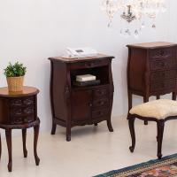 天板はレザー調の特殊仕上げで高級感があります。手彫り仕上げ、引出し内部の底のフェルト加工など、ハンドメイド感いっぱいの電話台。優美で洗練された曲線が印象的な、中世ヨーロッパ調の猫脚FAX台。
