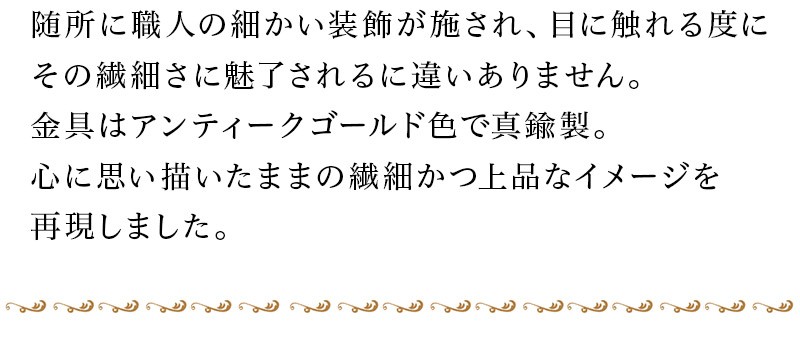 | 優美で洗練された曲線が実に印象的なシリーズになります。 使うたびに心安らぐひとときを演出し、ロマンチックな空間を彩ります。 お部屋の一角をエレガントなデスクスペースに演出。 パソコンデスクや作業台、玄関先の飾り棚としても便利な薄型デスクになります。 | |||