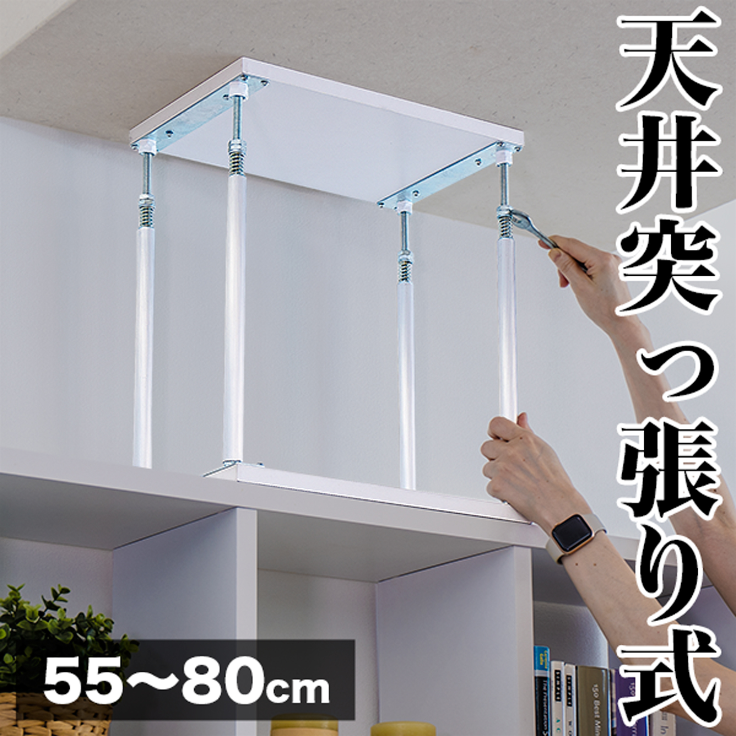 | 本棚やラックの天井との空間に突っ張ることで、地震対策として、間仕切り家具を安定させる器具として、それらの家具を固定します。特に当店で販売中のスクエアラックには最適な天井突っ張り器です。突っ張り棒の中心とスクエアラックの縦の仕切り板の中心が同じライン上に重なり、安定感があります。 |