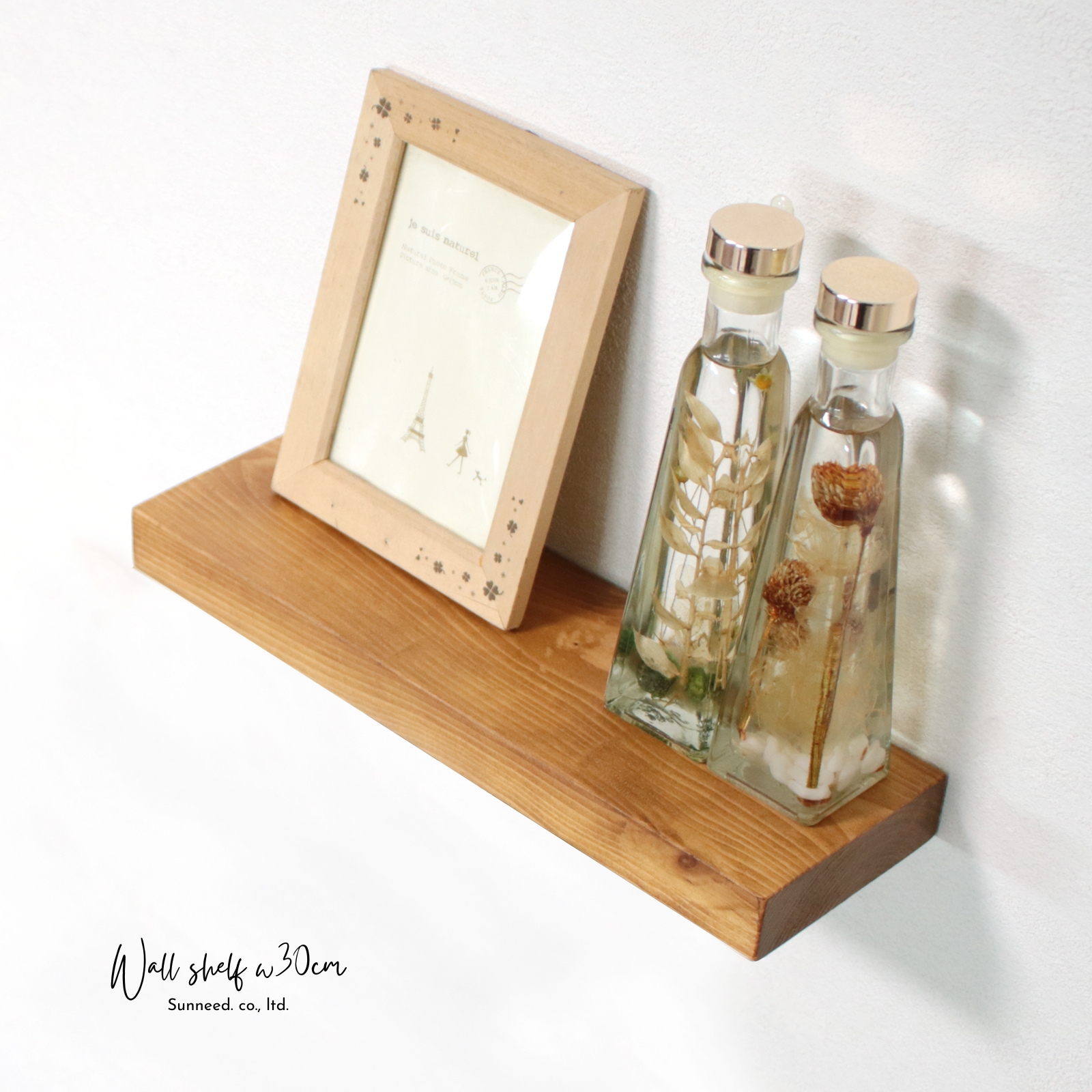 棚受け金具が殆ど見えないので、作り付けの棚のように見えるスマートなデザインのウォールシェルフです。