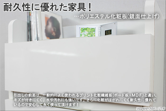 ■素材:引き出し前面/ポリエステル化粧板(鏡面仕上・艶あり単色)、その他主材/プリント紙化粧合板