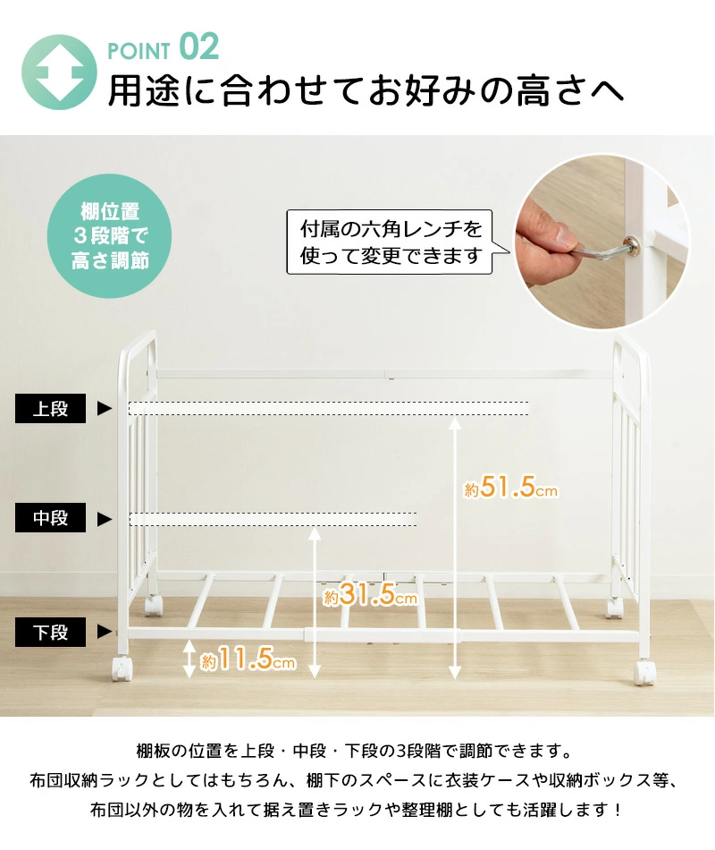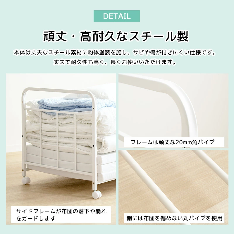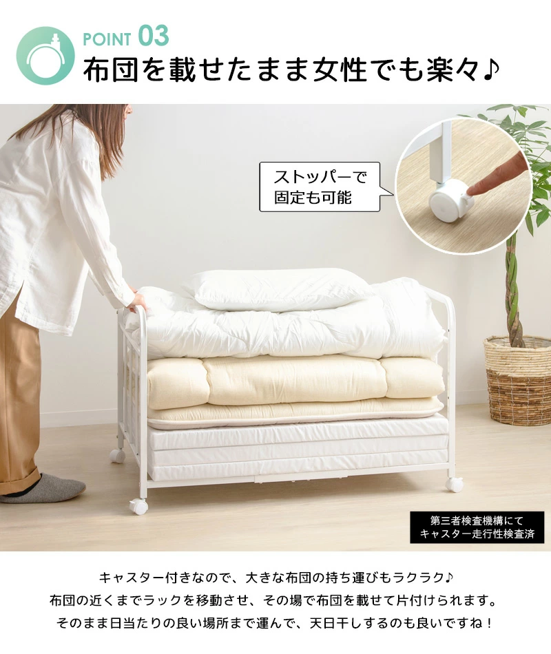 ●キャスター付きで移動も簡単、布団の上げ下げや持ち運びも楽々。