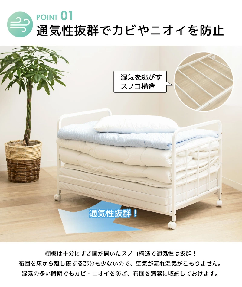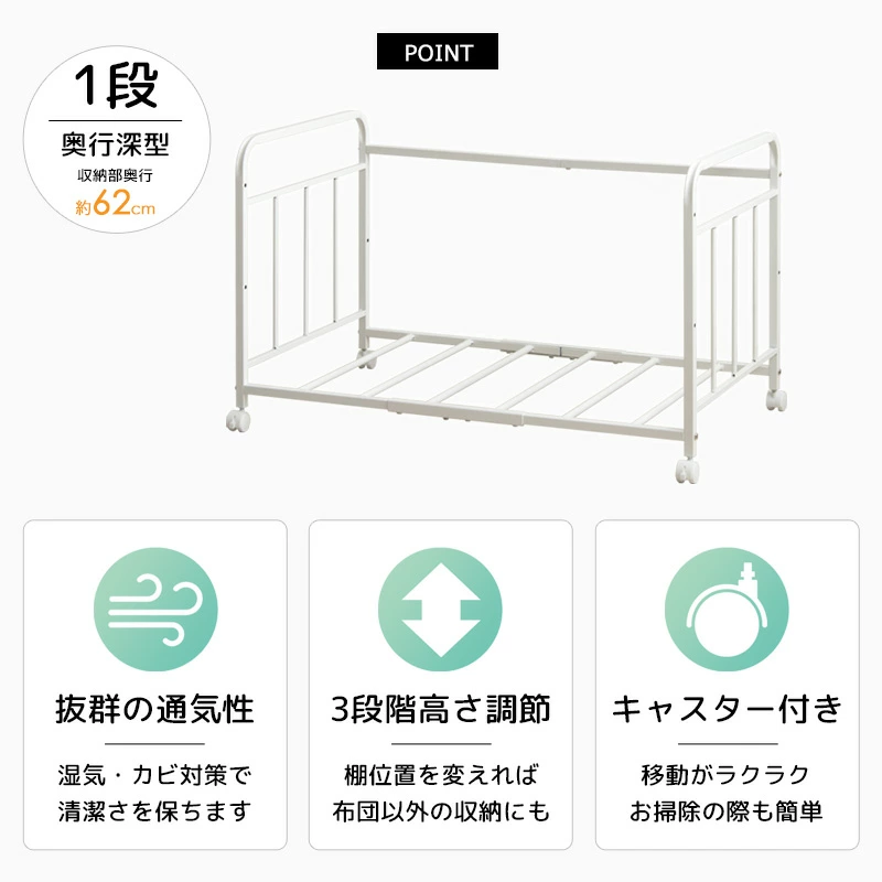 布団ラック 1段 奥行深型 布団収納ラック 布団収納 押入れ クローゼット 毛布 マットレス 収納 大容量 キャスター付き 省スペース 通気性 カビ対策 白 ホワイト