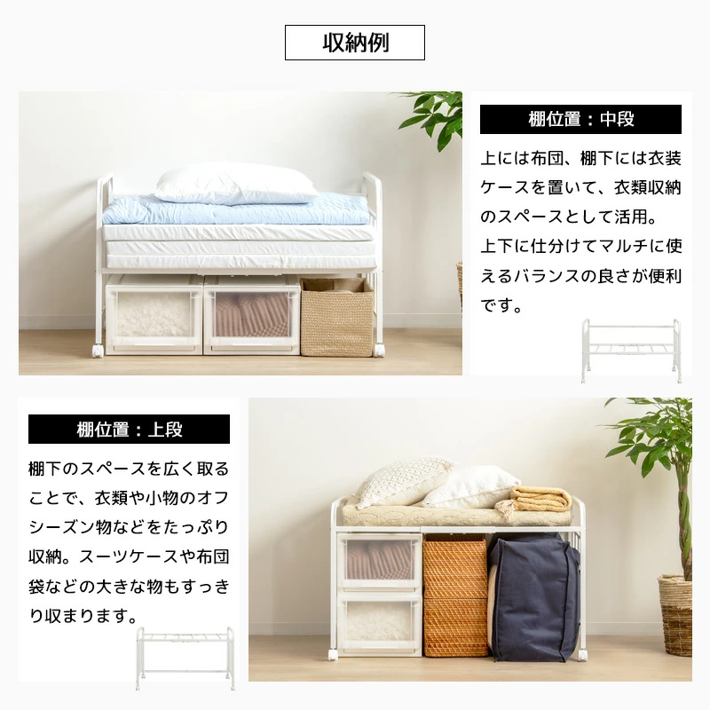 ●棚位置は3段階で調節可能、下に衣装ケースや収納ボックスを置けます。