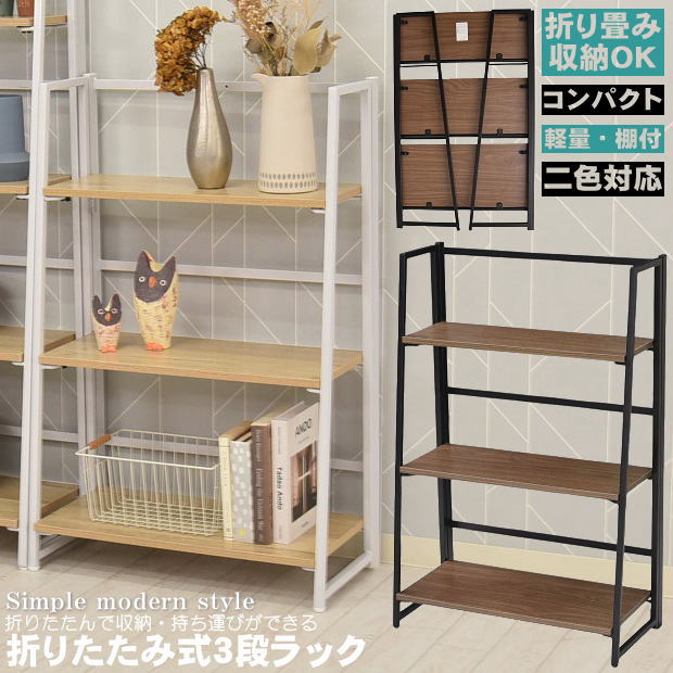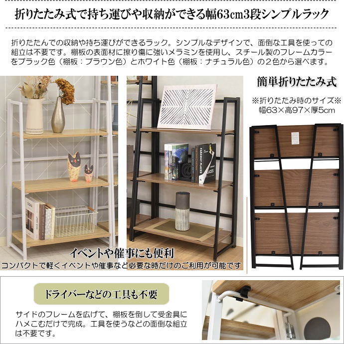 | 商品名 | 折りたたみ式で持ち運びや収納ができる幅63cmロータイプ3段ラック (ブラック色×ブラウン色・ホワイト色×ナチュラル色) | |