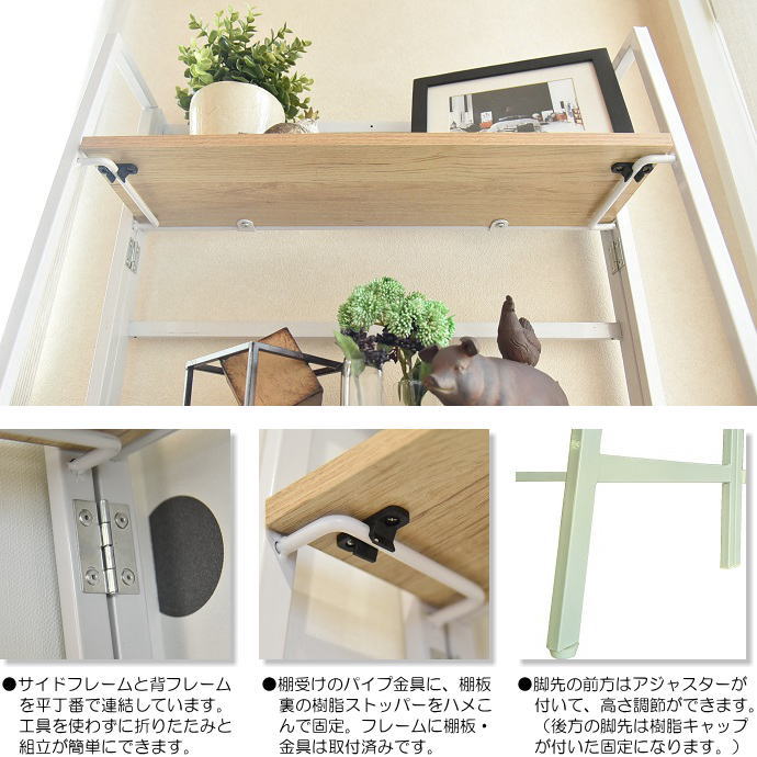 | 商品特徴 | ・折りたたんで収納・持ち運びができるロータイプの3段ラック。コンパクトで軽く、イベントや催事など必要な時だけのご利用が可能です。 ・フレームカラーをブラック色(棚板:ブラウン色)とホワイト色(棚板:ナチュラル色)の2色からお選びください。 ・サイドのフレームを広げて、棚板を倒して受金具にハメこむだけで完成。工具を使うなどの面倒な組立は不要です。 ・スチール製のフレームで、脚先の前方はアジャスターが付いて高さ調節ができます。(後方の脚先は樹脂キャップが付いた固定になります。) ・棚板の表面材には擦り傷に強いメラミンを使用。フレームカラーのブラック色は木目柄ブラウン色、ホワイト色は木目柄ナチュラル色のメラミンです。 ・シンプルなデザインのナチュラルモダンスタイルです。 ・幅63×奥行31×高97cmのコンパクトサイズ。お部屋を広く使えて、圧迫感がありません。 ・商品重量約8.5kgと軽く、折り畳むと厚さ5cmになり持ち運びがしやすくコンパクトに収納できます。 (耐荷重)棚板:約10kg | |