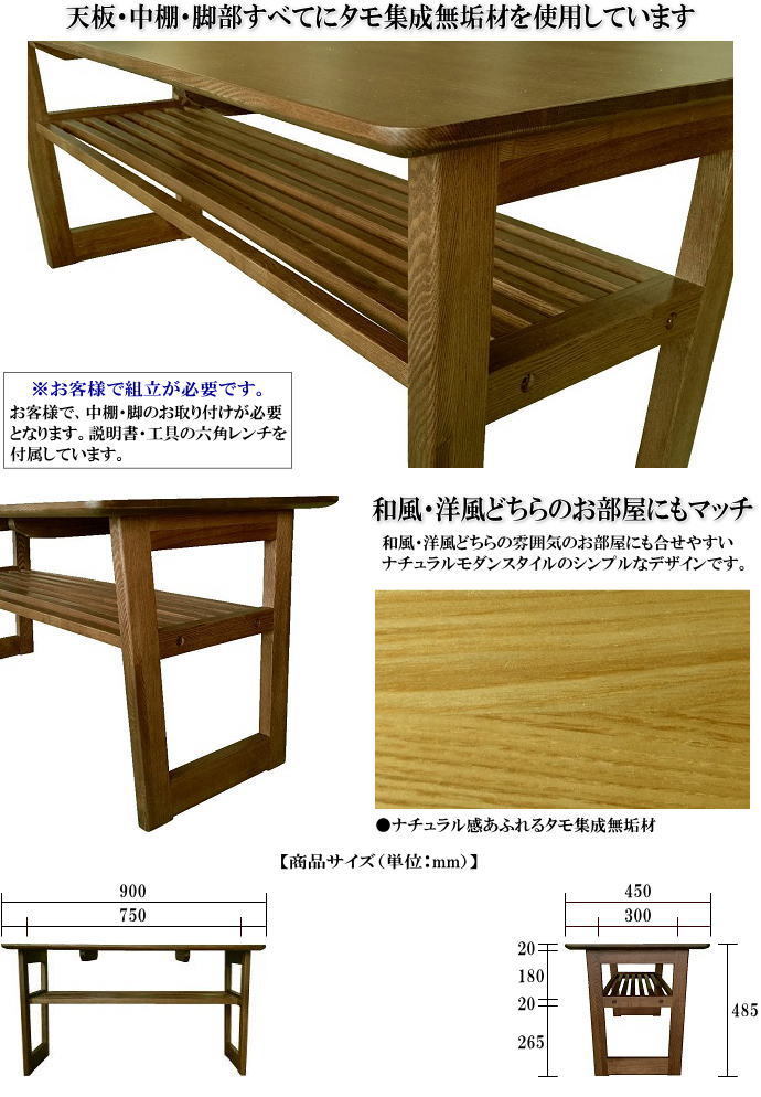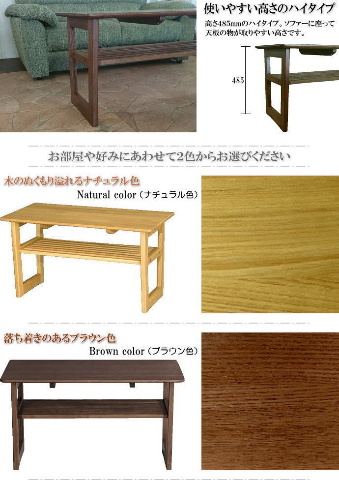 | 商品特徴 | ・ナチュラル色とブラウン色の2色からお選びください。 ・木目が綺麗なタモ集成無垢材を、ふんだんに使用した木の温もり溢れるセンターテーブル。厚さ20mmの天板だけではなく、中棚や脚部にもタモ材を使用して高級感があります。 ・天板サイズ90cm×45cmのスリムなコンパクト設計。ソファーに座って天板の物が取りやすい、高さ485mmのハイタイプです。 ・天板下に固定の中棚が付いています。新聞や雑誌・リモコン等が置くことができ便利です。 ・和風・洋風どちらの雰囲気のお部屋にもあわせやすいナチュラルモダンスタイルのシンプルなデザインです。 ・お客様で、中棚・脚のお取り付けが必要となります。(説明書・工具の六角レンチを付属しています。) | |