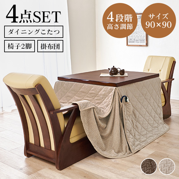 ダイニングこたつ こたつ布団 長方形 こたつテーブルセット コタツ ハイタイプ 高さ調節 おしゃれ チェア 4点セット 90×90cm 山城 ポカ