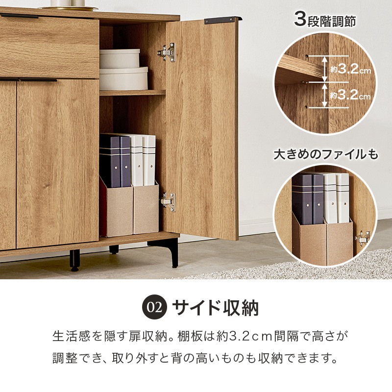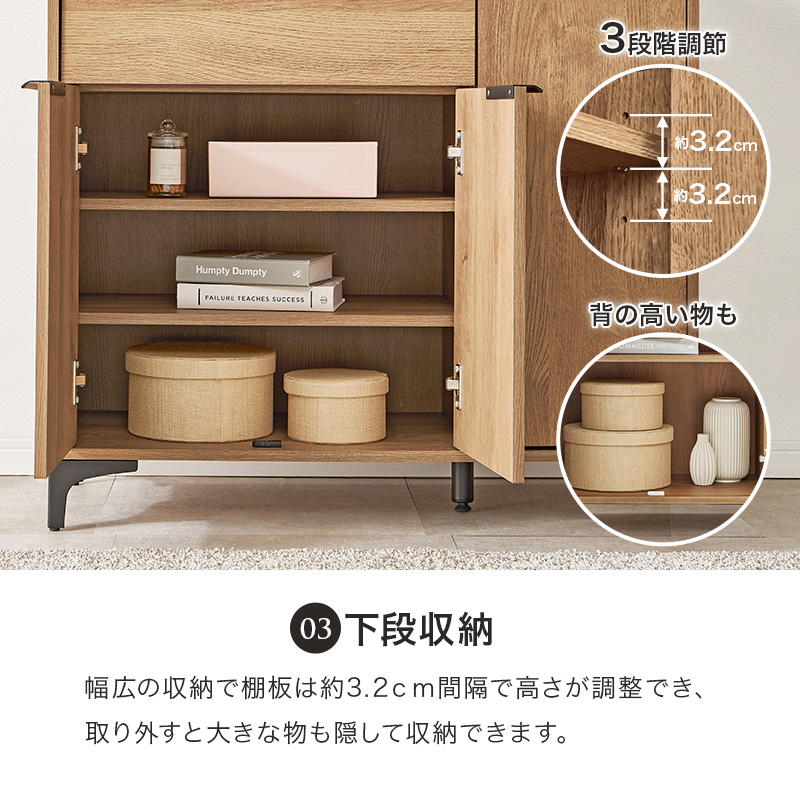 下段収納は横幅のあるものの収納に、サイド収納は背の高いものの収納に。