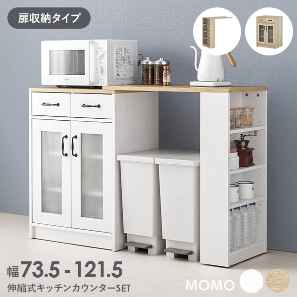 伸縮ラック キッチン キッチンラック 棚 キッチンカウンター 伸縮 キッチンカウンター 天板 拡張 食器棚 ロータイプ キッチン収納棚 扉付き 白 キッチン台 モモ