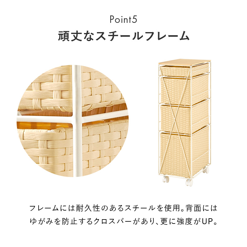 3種類の高さの引き出しは、編み込み式のPE素材。