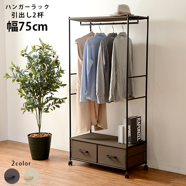 ハンガーラック 引出し2杯 幅75cm シンプル 収納ラック コンパクト 衣類収納 省スペース ハンガー掛け ホワイト