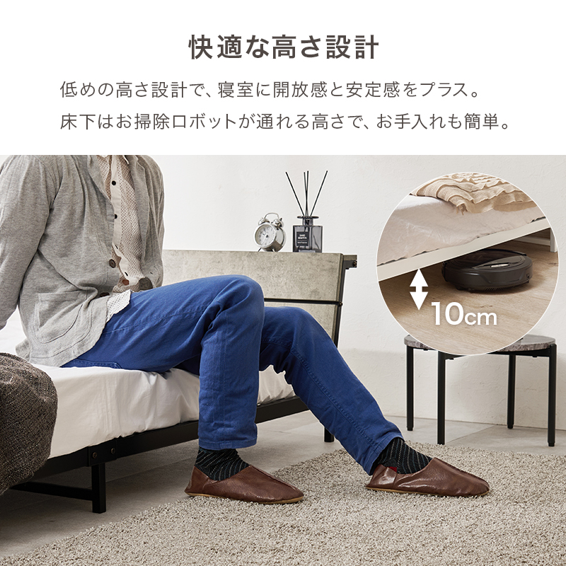 木目調のヘッドボード×スチールフレームの組み合わせがおしゃれなパイプベット。
