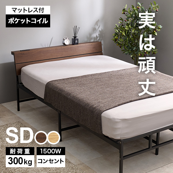 ベッド ベッドフレーム マットレス付き セミダブル 収納 パイプベッド セミダブルベッド 安い ローベッド 宮付き コンセント付き ポケットコイル 耐荷重300kg