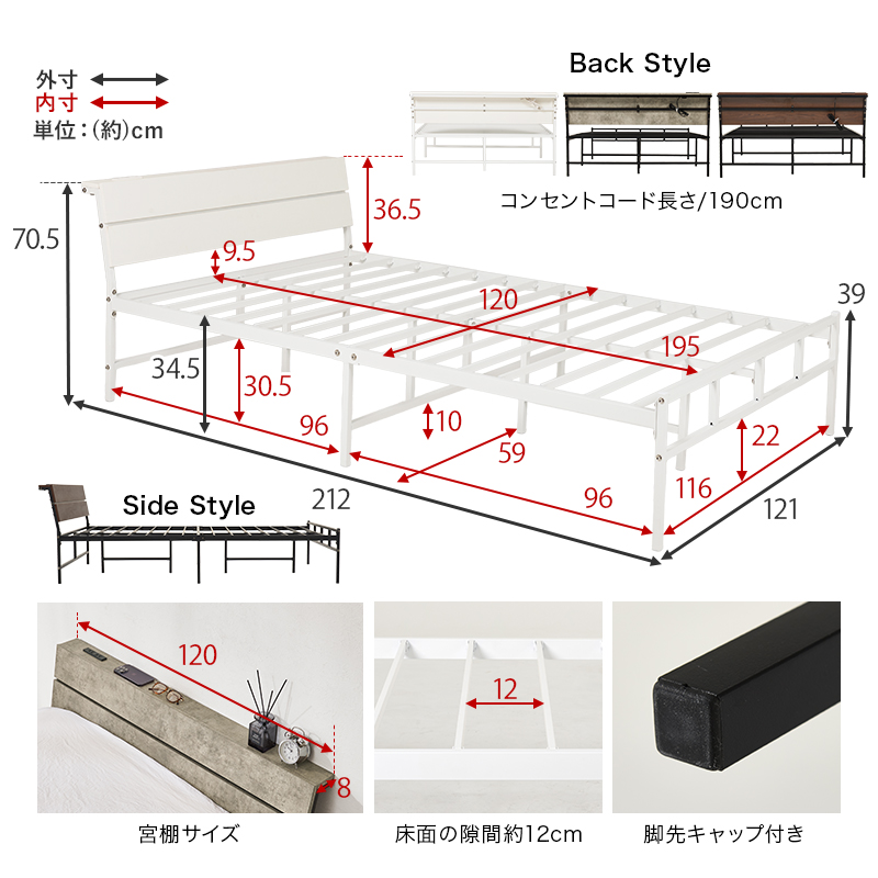 ベッド ベッドフレーム マットレス付き セミダブル 収納 パイプベッド セミダブルベッド 安い 宮付き コンセント付 ポケットコイル 耐荷重300kg ハイタイプ 頑丈