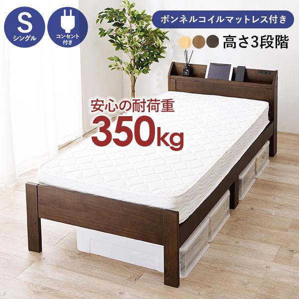 ベッド マットレス付き シングル ボンネルコイル 圧縮 ベッドフレーム 収納 すのこ 木製 コンセント すのこベッド 宮付き 高さ調整 頑丈