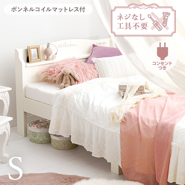 ベッド ベッドフレーム マットレス付き シングル 姫系 可愛い 白 収納 すのこベッド お姫様ベッド プリンセス すのこ ボンネルコイル 組み立て簡単 ネジレス