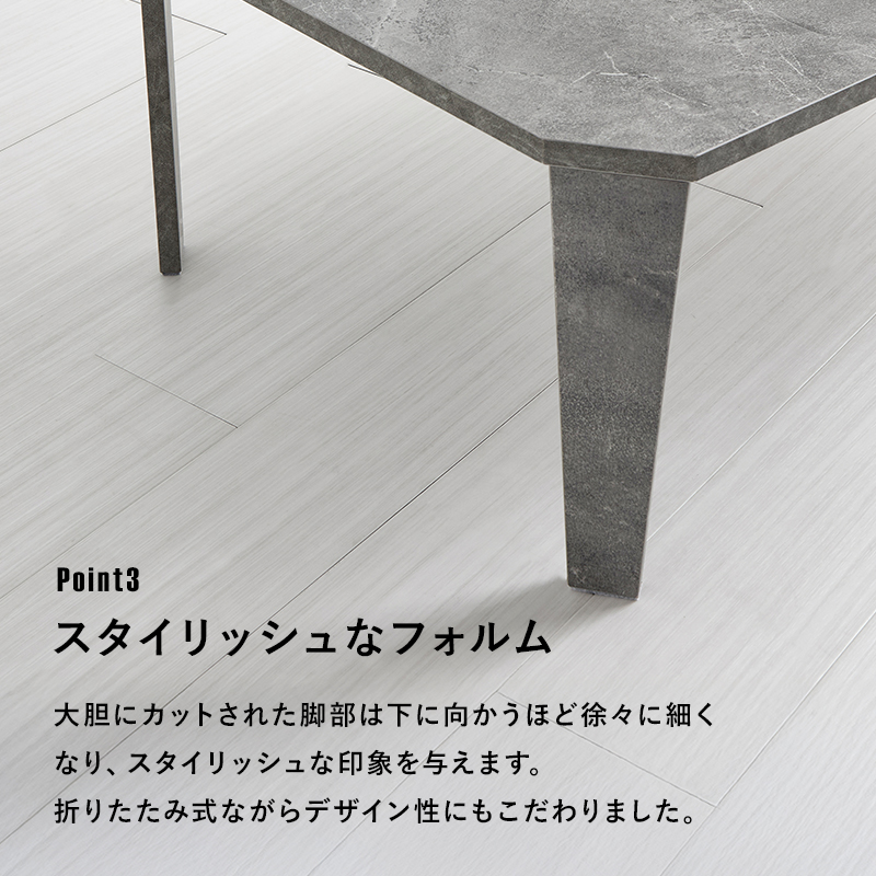 スタイリッシュな脚を組み合わせた折り畳みテーブル。