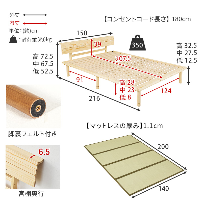 畳ベッド ダブル ベッド 畳 ダブルベッド マットレス付き すのこベッド D ベッドフレーム すのこ コンセント 畳ベット 宮付き 宮棚