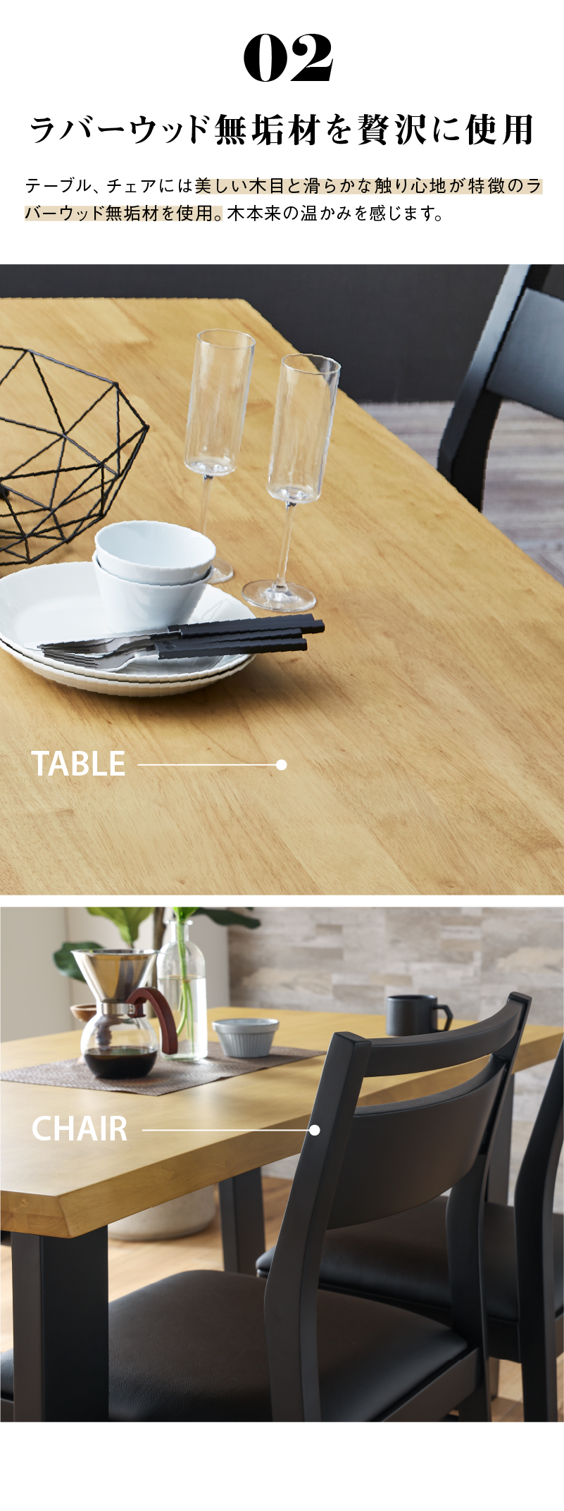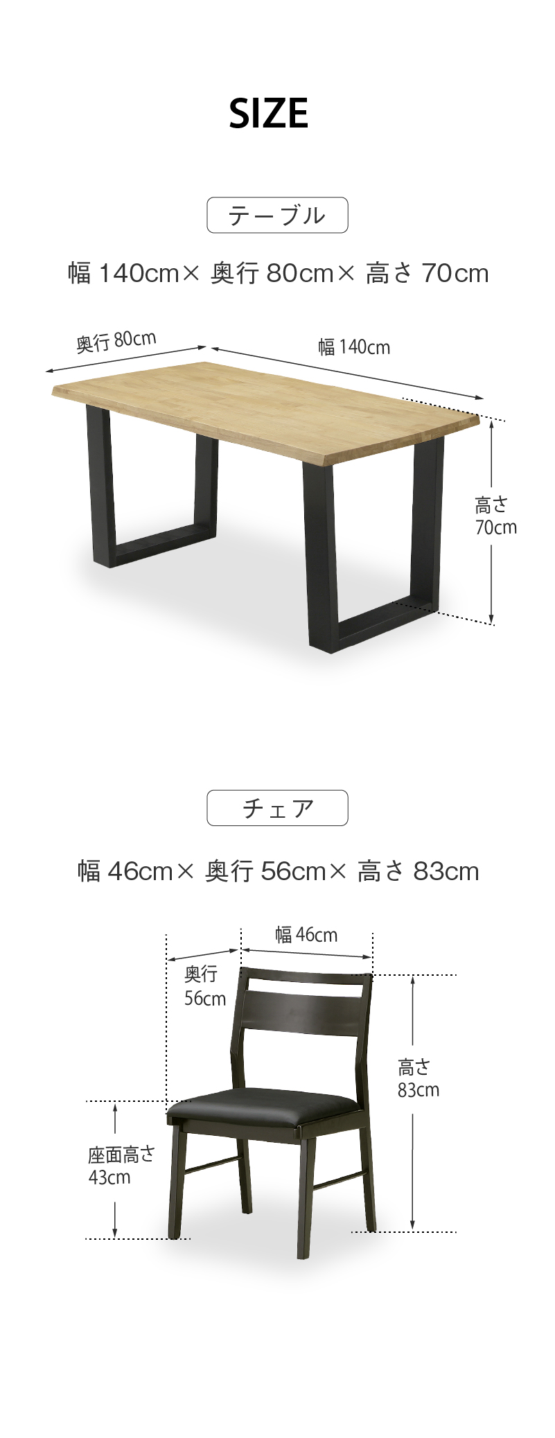 テーブル:幅140cm×奥行80cm×高さ70cmチェア:幅46cm×奥行56cm×高さ83cm(座面高43cm)