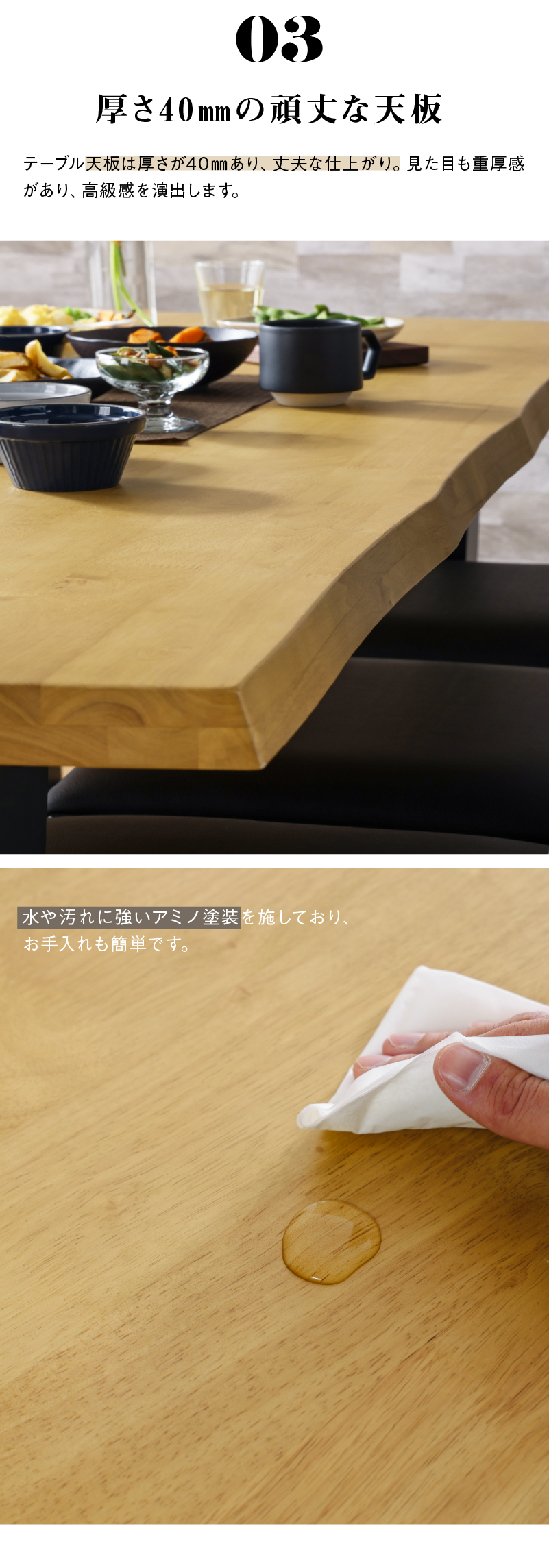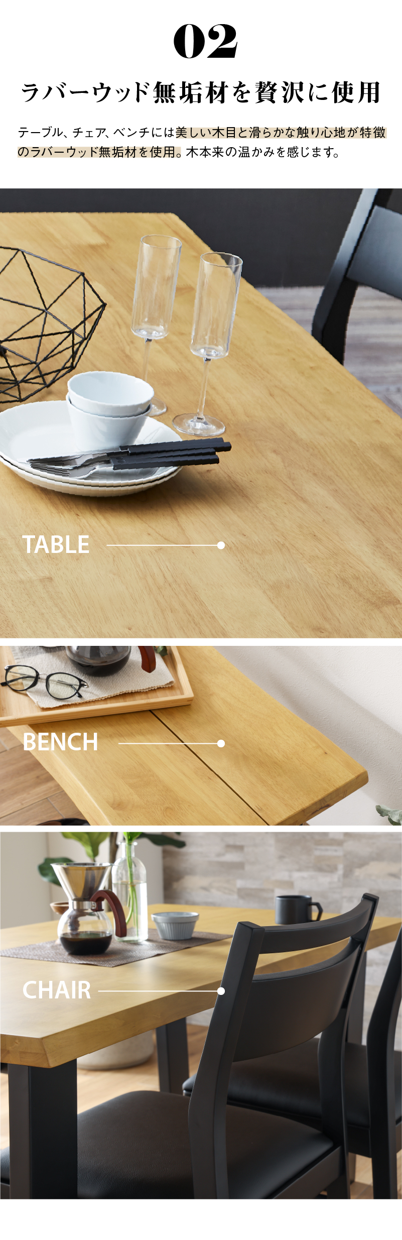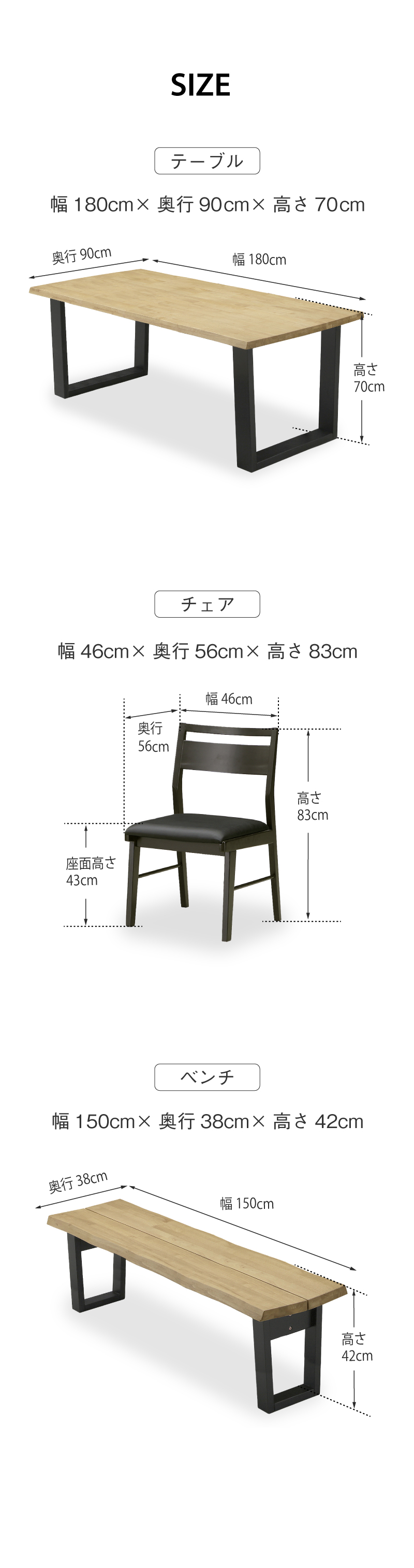 テーブル:幅180×奥行90×高さ70cm チェア:幅46×奥行56×高さ83cm(座面高43cm) ベンチ:幅150×奥行38×高さ42cm |