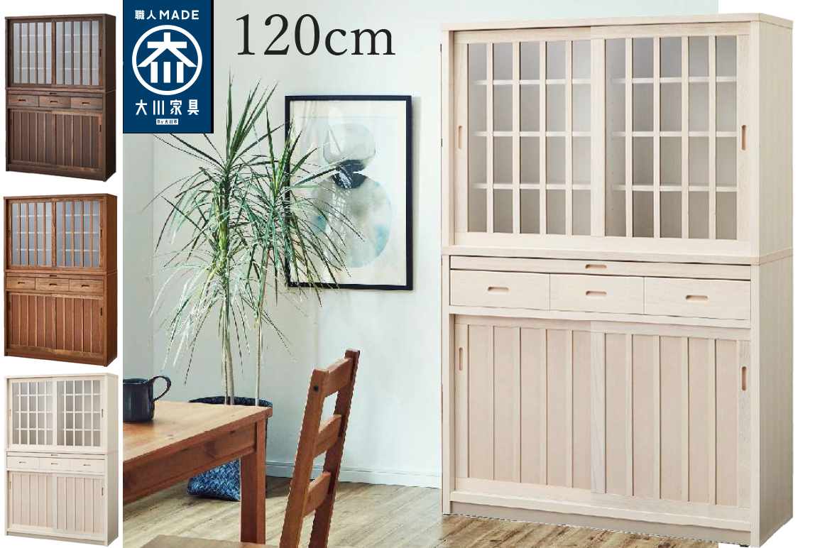 幅120cm 高さ170cm 引き戸 食器棚 スライド式カウンター付き カップボード 桐材 天然木 ガラス 木製 和風 大川家具 家具 インテリア 和風 キッチン 台所 収納