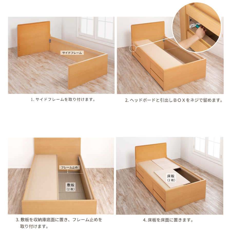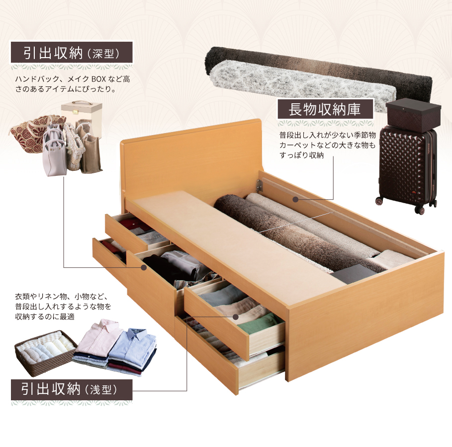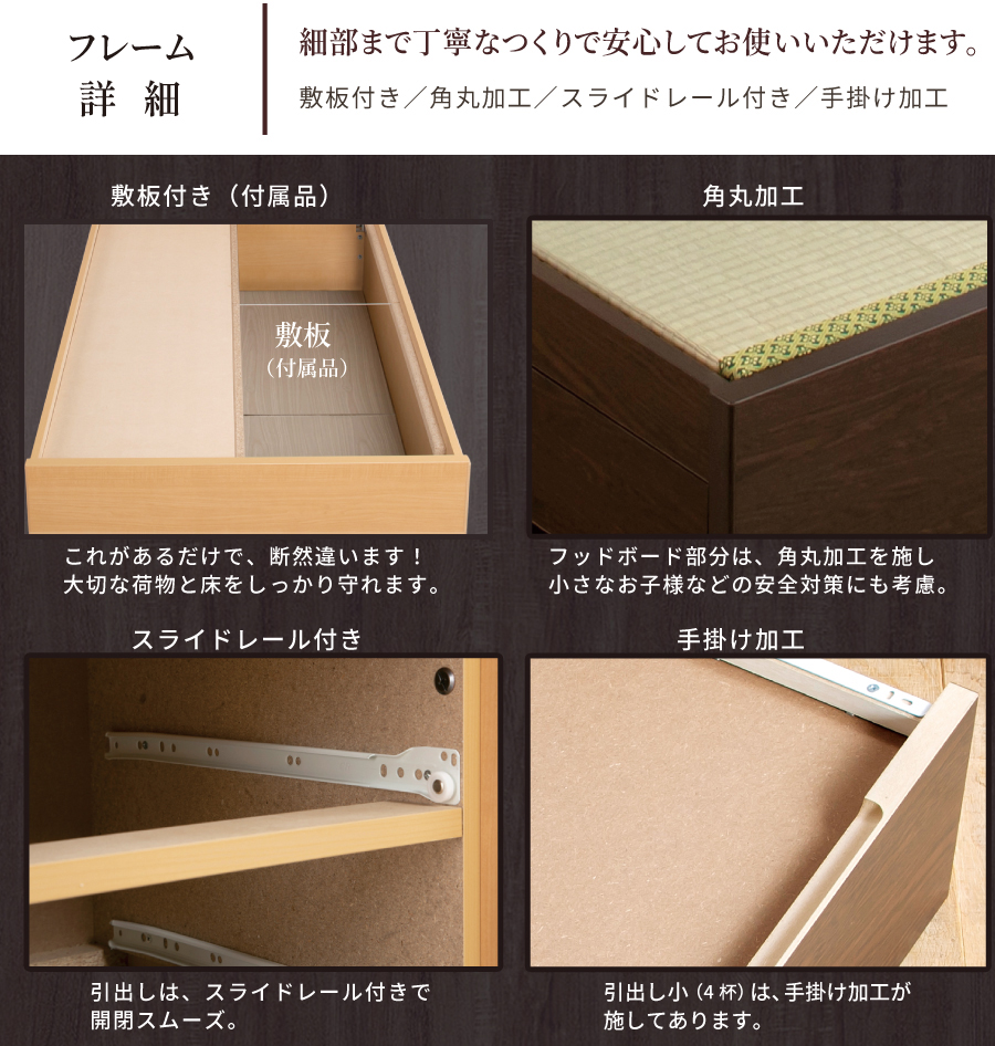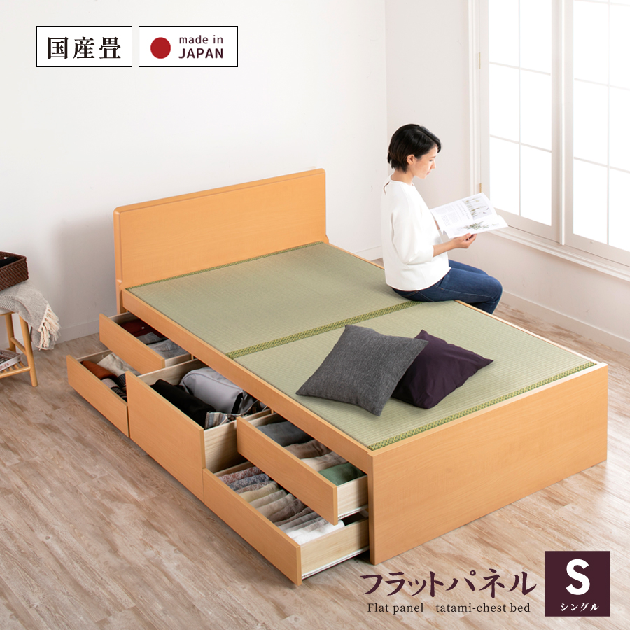 畳ベッド 収納付 シングル ベッドフレーム 引出し収納 日本製 国産畳 へり付畳 大容量収納 引出レール付 フラットパネル 暁月 あかつき