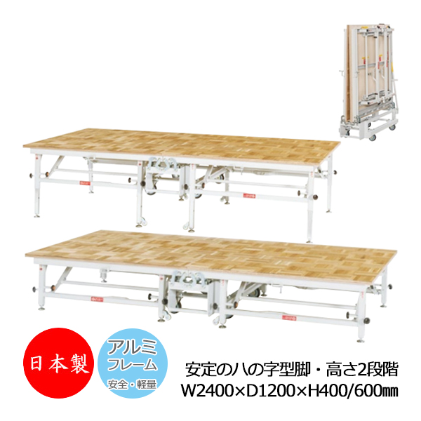 ポータブルステージ アルミ製 天板木貼り 高さ2段階 40cm 60cm 折りたたみ式 ハの字型脚 キャスター付き ステージ台 舞台 【送料別】 AL-0077