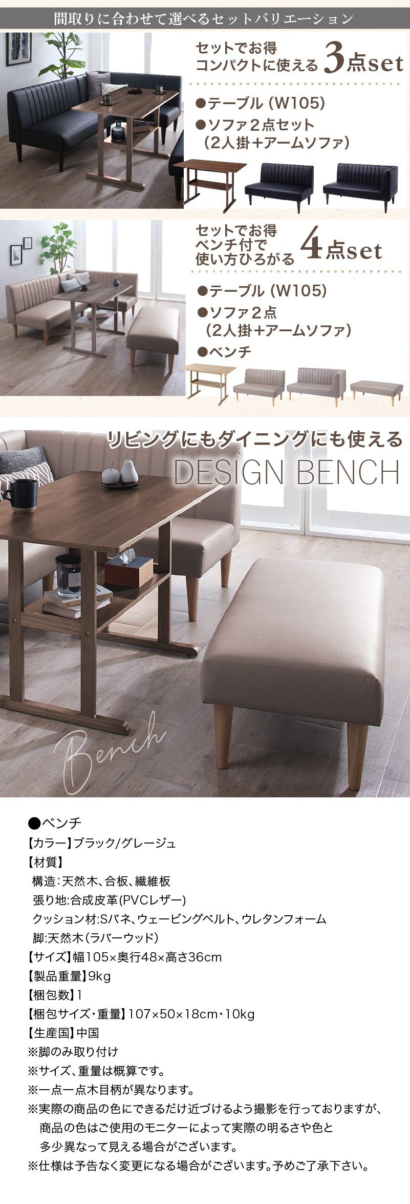 4点:テーブル+ソファ2点+ベンチ