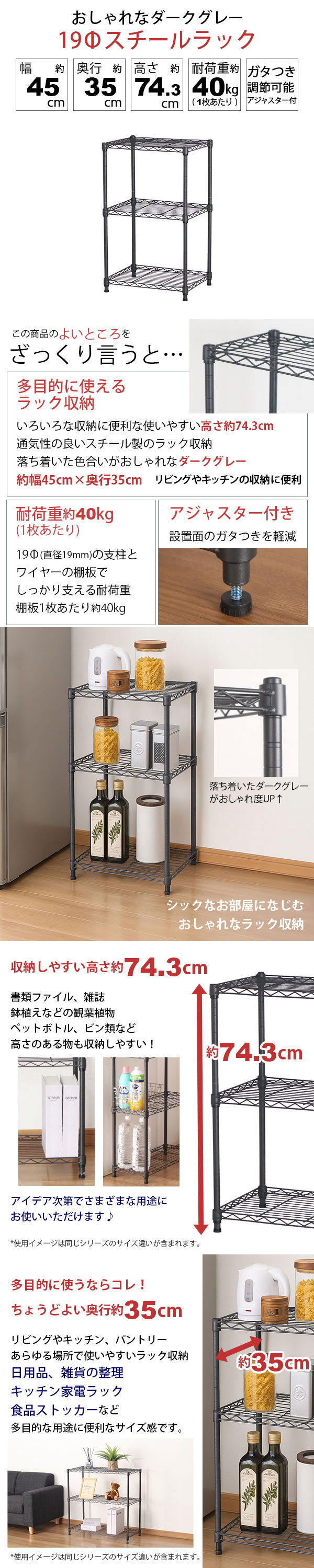 幅約45cm 奥行約35cm 高さ約74.3cm 耐荷重約40kg(1枚あたり) ガタつき調節可能アジャスター付き