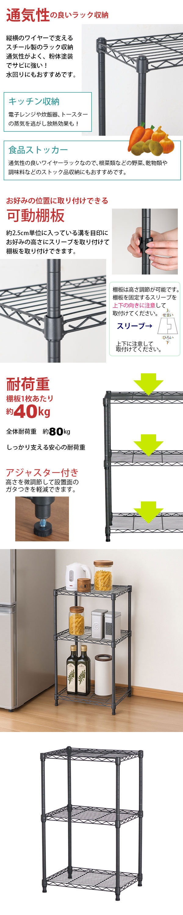 耐荷重(約):棚板垂直静止時40kgまで/枚