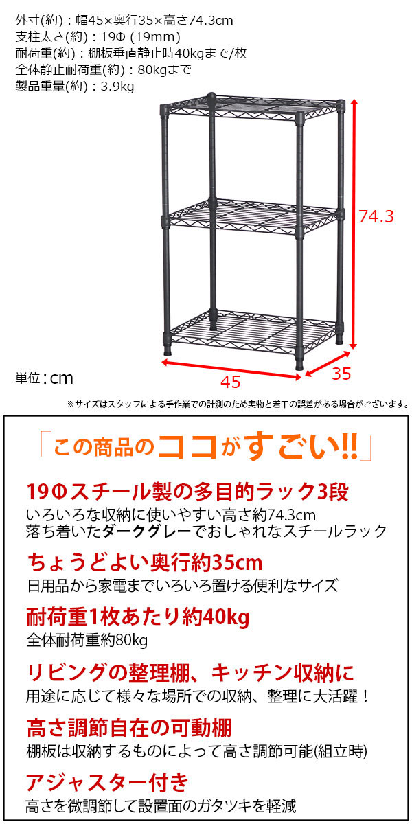 商品名:スチールラック 3段 スリム 幅45cm 奥行35cm 高さ74.3cm ダークグレー (約45×35x75cm) アジャスター付き おしゃれ くすみカラー メタル製ラック シェルフ 省スペース キッチンラック 隙間収納 頑丈 スリムラック ベッドサイドラック ソファ横 コンパクト 単品 AAS-4301 小さい オープンラック 高さを変えられる棚 丈夫 浅型 家具 インテリア 収納家具 棚 ラック 小型 三段ラック 低い 収納棚 低め スチールラック ロータイプ ローラック 高さ調整 マルチラック フリーラック 多目的ラック 整理棚 オープン棚 オープンシェルフ キッチン収納棚 レンジラック 家電収納 調理家電