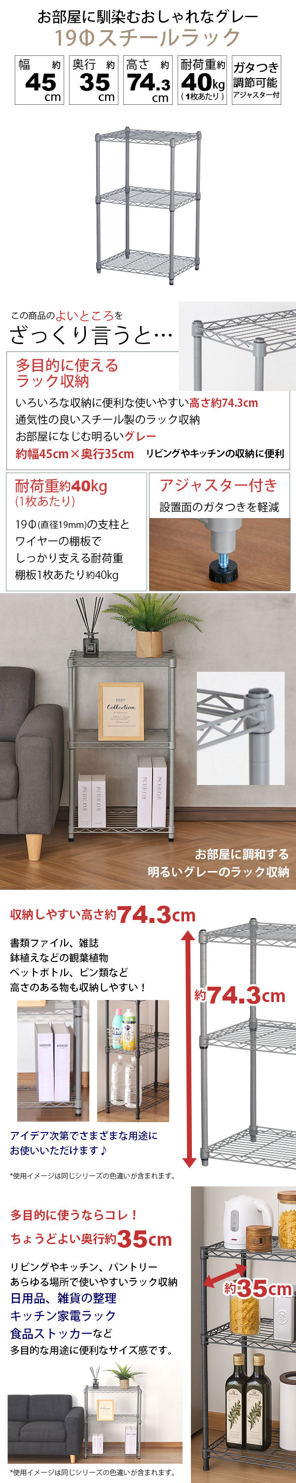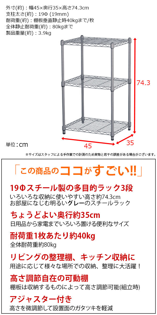 幅約45cm 奥行約35cm 高さ約74.3cm 耐荷重約40kg(1枚あたり) ガタつき調節可能アジャスター付き