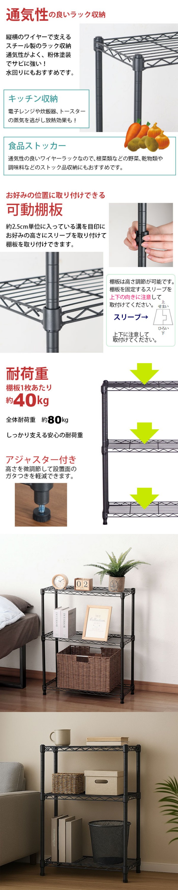耐荷重(約):棚板垂直静止時40kgまで/枚