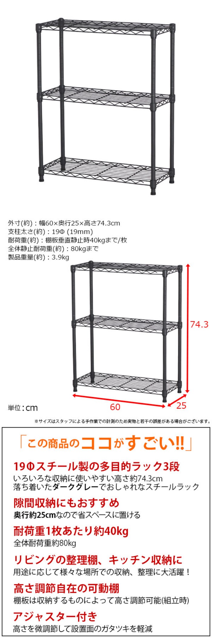 幅約60cm 奥行約25cm 高さ約74.3cm 耐荷重約40kg(1枚あたり) ガタつき調節可能アジャスター付き