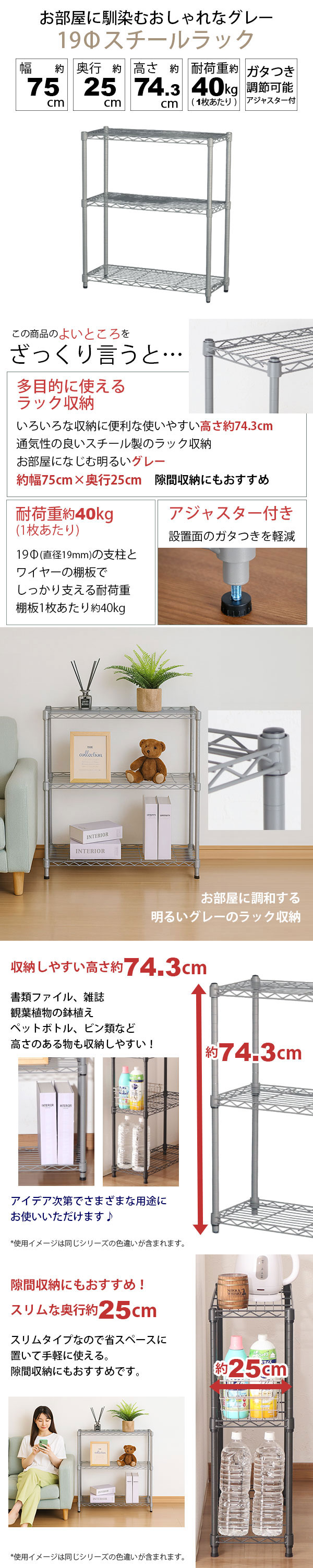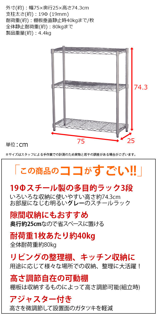幅約75cm 奥行約25cm 高さ約74.3cm 耐荷重約40kg(1枚あたり) ガタつき調節可能アジャスター付