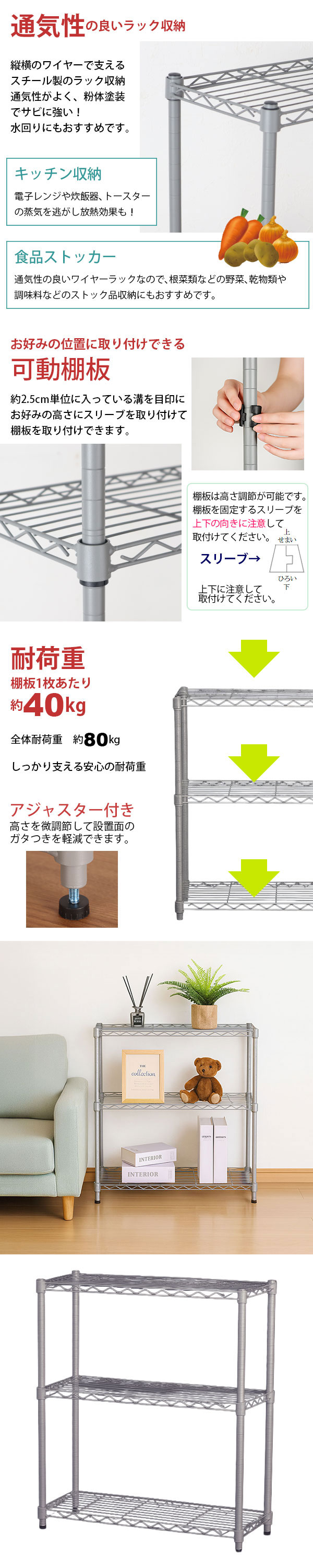 耐荷重(約):棚板垂直静止時40kgまで/枚