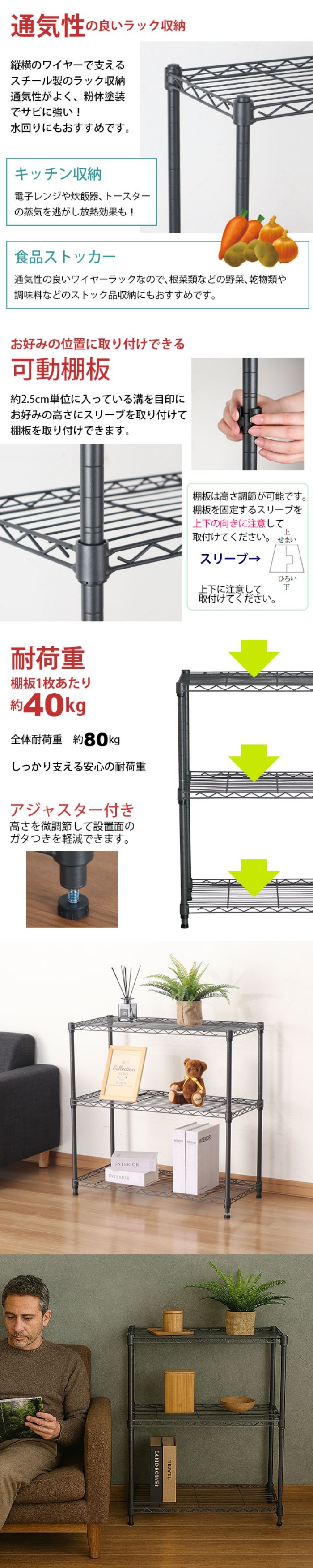 通気性の良いワイヤーラックなので、根菜類などの野菜、乾物類や調味料などのストック品収納にもおすすめです。