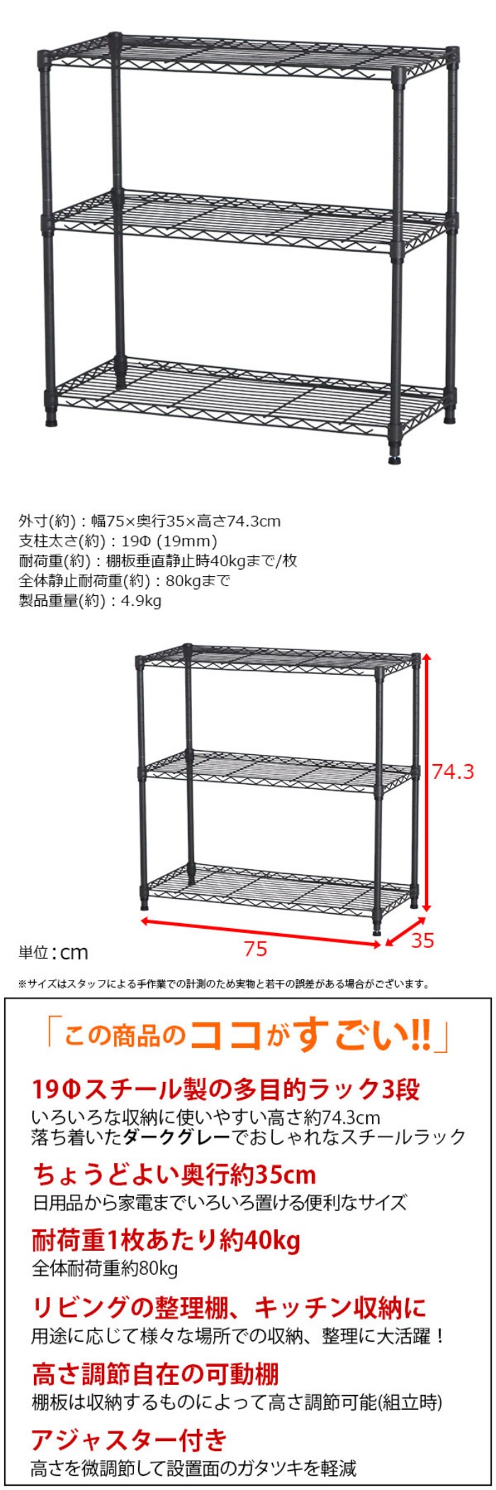 商品名:スチールラック 3段 スリム 幅75cm 奥行35cm 高さ74.3cm ダークグレー (約75×35x75cm) アジャスター付き おしゃれ くすみカラー メタル製ラック シェルフ 省スペース キッチンラック 隙間収納 頑丈 スリムラック ベッドサイドラック ソファ横 コンパクト 単品 AAS-7301 小さい オープンラック 高さを変えられる棚 丈夫 浅型 家具 インテリア 収納家具 棚 ラック 小型 三段ラック 低い 収納棚 低め スチールラック ロータイプ ローラック 高さ調整