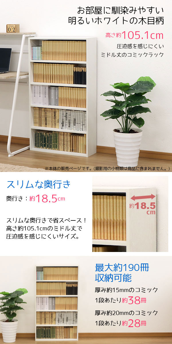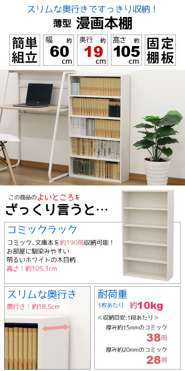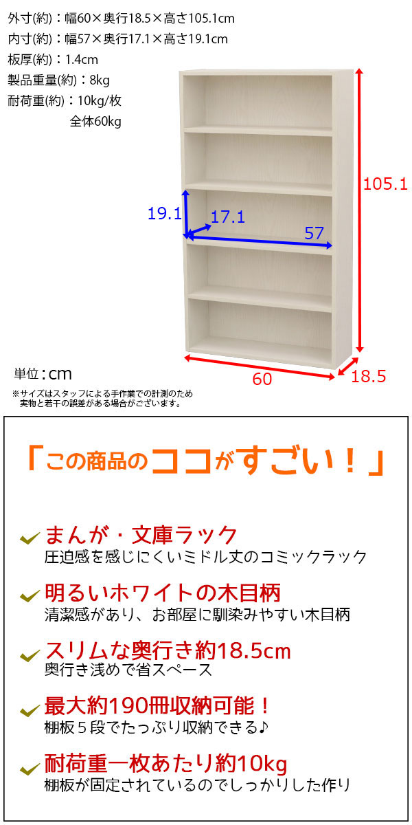 商品名:2個セット 漫画 本棚 薄型 コミックラック 最大190冊収納(目安) 幅60cm 奥行18.5cm 高さ105.1cm(約105cm) 奥行20cm以下 19cm以下 浅型 奥行が浅いコミック収納 子ども部屋 シンプル おしゃれ かわいい コンパクト まんが マンガ 本棚 文庫ラック 文庫本棚 リビング MBA-500 多目的棚 木目柄 寝室 キッチン CD DVD Blu-ray ブルーレイ ホワイト 白