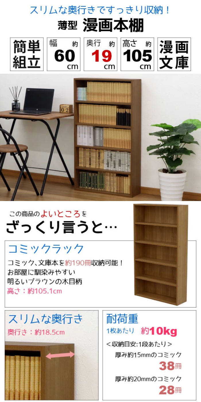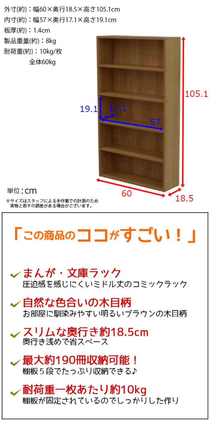 商品名:漫画 本棚 薄型 コミックラック 最大190冊収納(目安) 幅60cm 奥行18.5cm 高さ105.1cm(約105cm) 奥行20cm以下 19cm以下 浅型 奥行が浅いコミック収納 子ども部屋 シンプル おしゃれ かわいい コンパクト まんが マンガ 本棚 文庫ラック 文庫本棚 リビング MBA-600 単品 多目的棚 木目柄 寝室 キッチン CD DVD Blu-ray ブルーレイ ブラウン