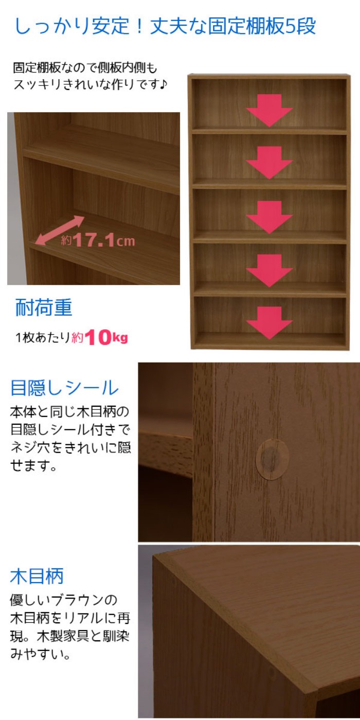 しっかり安定!丈夫な固定棚板5段