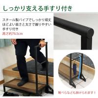 手すり付きスチール製踏み台 使いやすい 玄関の昇り降り ひざなどの体への負担を減らす 転倒を予防する 横倒れや揺れを防ぐ 三角脚 寒い時期でもヒヤッとしない 安全 木目調×ブラック 玄関周り スッキリ美しくみせる 玄関スペースを有効活用 スチールフレーム 補強 しっかりとしたつくり 安定感 一般家庭用
