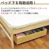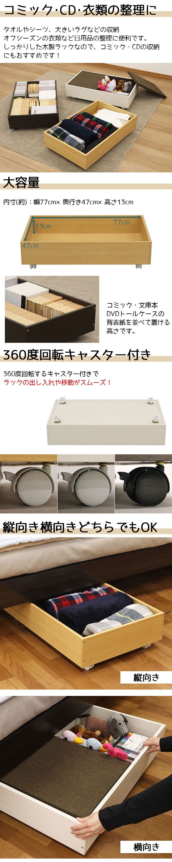 | シンプルなキャスター付きのベッド下収納ラック(ベッド下収納 ラック)です。 底板の厚みは約1.3cmもあり、とても頑丈な作りになっています♪ たっぷり入る大きめサイズでベッド下のデッドスペースを有効活用できる収納ラックです。 丈夫な造りで、CD・コミックの収納にも便利。 内寸(約):幅77cm×奥行き47cm×高さ13cm コミック・文庫本、DVDトールケースの背表紙を並べて置ける高さです。 360度回転するキャスター付きでラックの出し入れや移動がスムーズ! (キャスターを外してご使用は可能ですが、接地面が傷つく恐れがありますので、床面の保護をおすすめいたします) 縦向き横向きどちらでもOK ネジ穴を綺麗に隠す目隠しシール付き |
