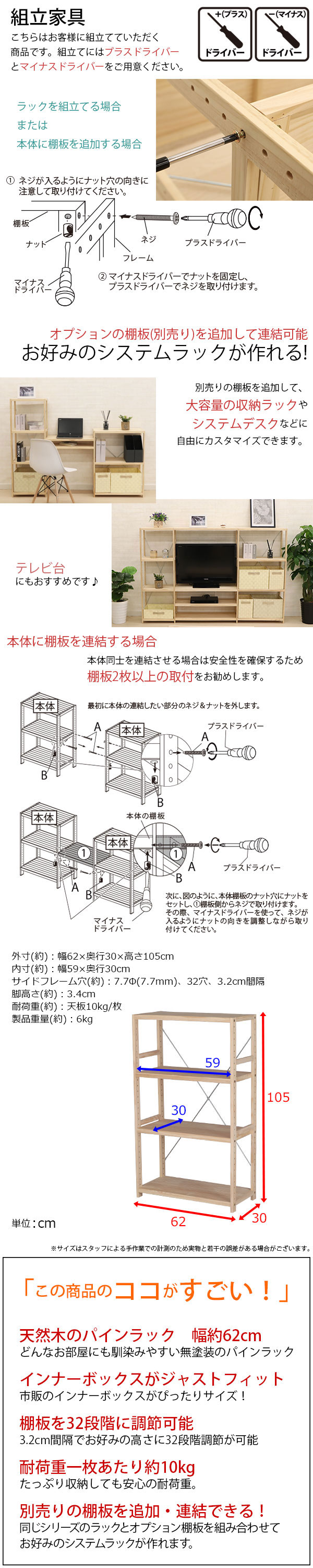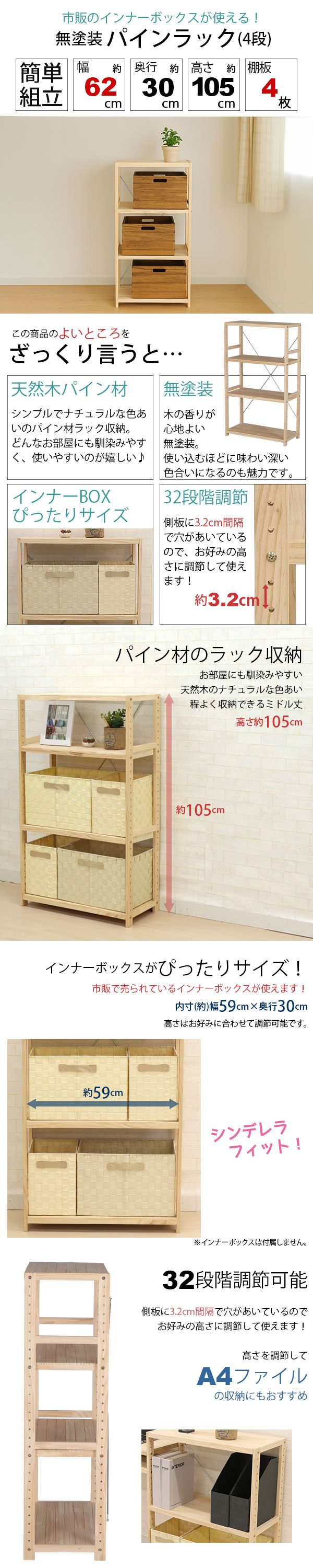 無塗装 パインラック4段 幅約62cm 奥行約30cm 高さ約105cm の説明