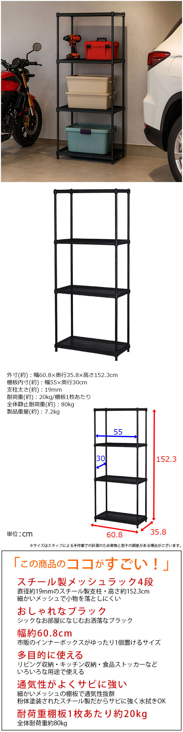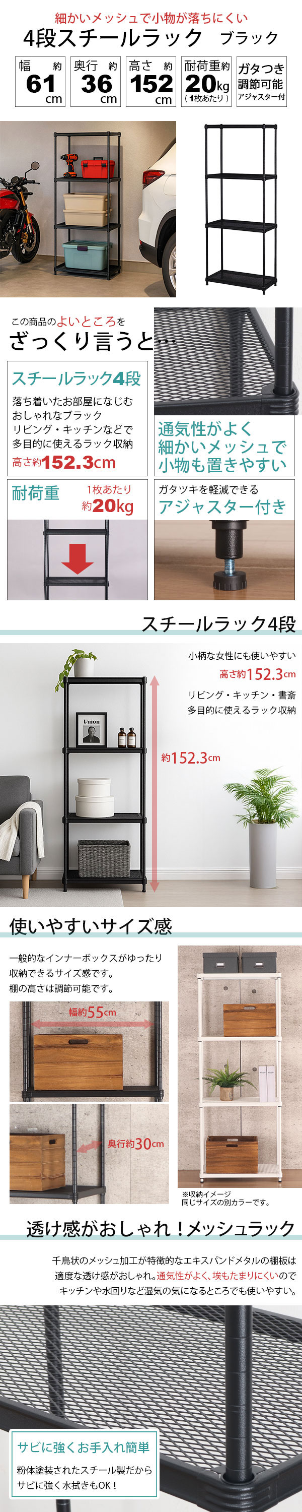幅約61cm 奥行約36cm 高さ約152cm 耐荷重約20kg(1枚あたり)ガタつき調節可能アジャスター付